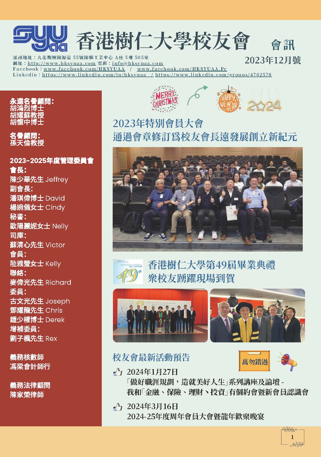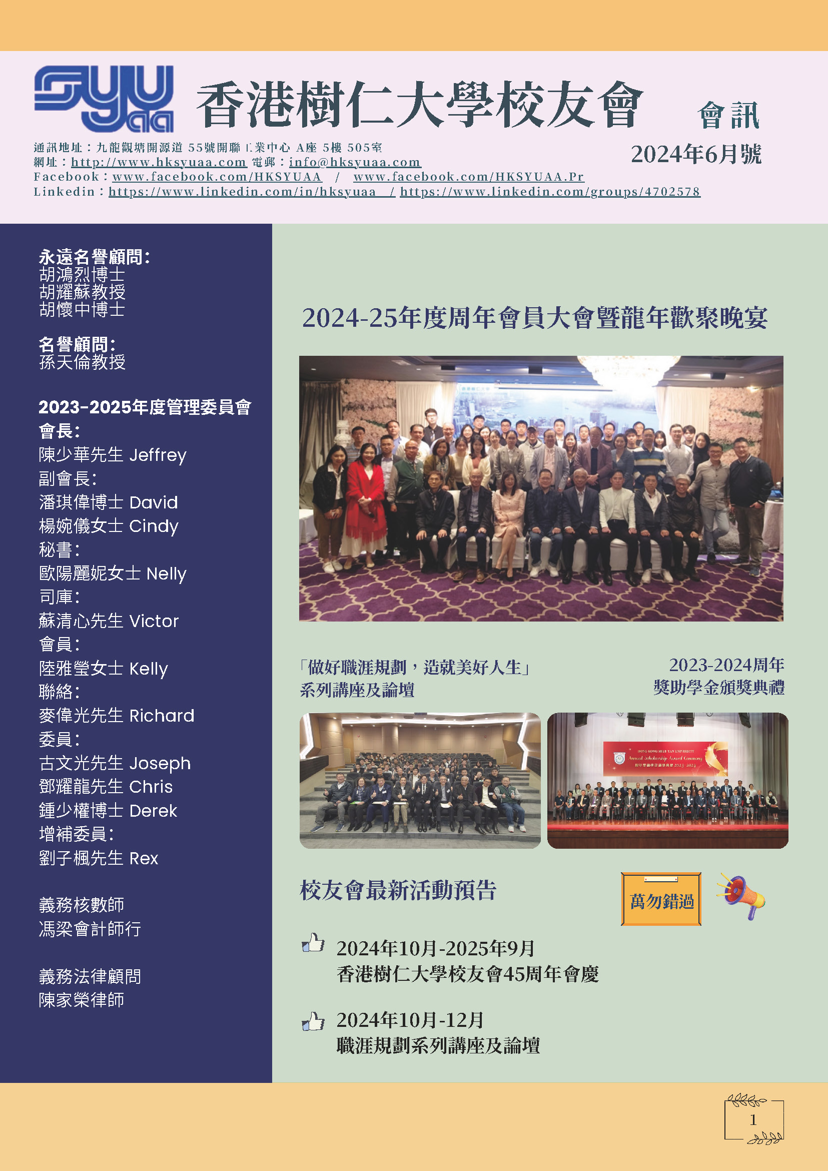 校友會會訊 2024年6月號 2023年12月號 2023年6月號 2022年第3期 (12.2022) 2022年第2期 (7.2022) 2022年第1期 (2.2022) 2021年第5期 (10.2021) 2021年第4期 (7.2021) 2021年第3期 (5.2021) 樹仁簡訊 (校友會相關報導) 2024年春季季刊仁大校友會舉辦專題講座 分享職涯經歷及行業知識 2023年7月及8月號合刊憑藉良好學術聲譽及教學質素 仁大2023年收逾1300位新生 2023年5月及6月號合刊樹仁系友心懷母校 倡導交流成果共證 2023年1月及2月號合刊資深校友分享職涯錦囊 2022年3月及4月號合刊香港樹仁大學校友會周年會員大會「疫」流而上同場「元宇宙」專題講座激發熱烈迴響 50周年校慶特號校友會新任會長陳少華談工作目標 拓展年輕校友會員 支持終身學習 2021年4月號校友會新一屆管理委員會誕生 舉辦應用數據科學網上專題講座 2020年10月號樹仁校友會主席潘琪偉博士呼籲年輕校友加入校友會 並樂見母校以科技推動大學發展 樹仁簡訊本期和往期下載 校友會過往出版 品味南京兩地融和交流之旅2015 仁心仁路2014 樹仁大學校友會三十五週年特刊 樹仁學院校友會二十五週年特刊 樹仁學院校友會二十週年特刊 樹仁學院校友會十週年特刊